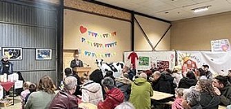 Die neue Bauernhof-Kita ist auf dem Gelände der traditionsreichen Lehr- und Versuchsanstalt für Viehhaltung Hofgut Neumühle beheimatet. Hautnah erleben die Kinder dort, wie Tiere versorgt, Pflanzen angebaut und Lebensmittel erzeugt werden. Die Bauernhofpädagoginnen Stefanie Jung und Dr. Theresa Scheu gaben den Gästen bei der Einweihung einen Einblick in das Konzept der „Bauernhofpädagogik“, das Lernen mit Kopf, Herz und Hand ermöglicht.