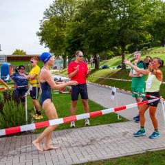 Es kann auch im Team gestartet werden: Der Ablauf ist prinzipiell gleich dem Einzelstart, nur übergibt der/die Schwimmer/in per Abklatschen an den/die Läufer/in.