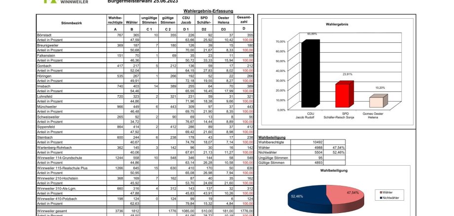 Bei der Bürgermeisterwahl der Verbandsgemeinde Winnweiler am 25. Juni 2023 waren 10.492 Personen wahlberechtigt. Von diesen nahmen 4.988 Wählerinnen und Wähler an der Wahl teil, was einer Wahlbeteiligung von 47,54 % entspricht.